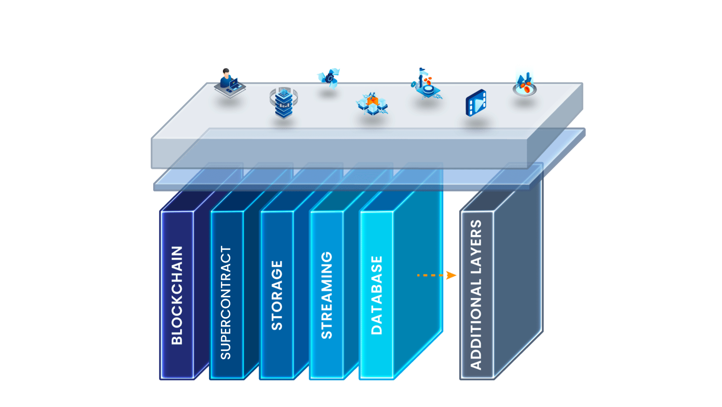 The expansion of service layers does not affect the performance of individual layers. This is similar to multiple sets of network server nodes running in parallel and held together by the blockchain at the core. Each set of network nodes performs a specific function, and the function power grows with more server nodes plugged in.